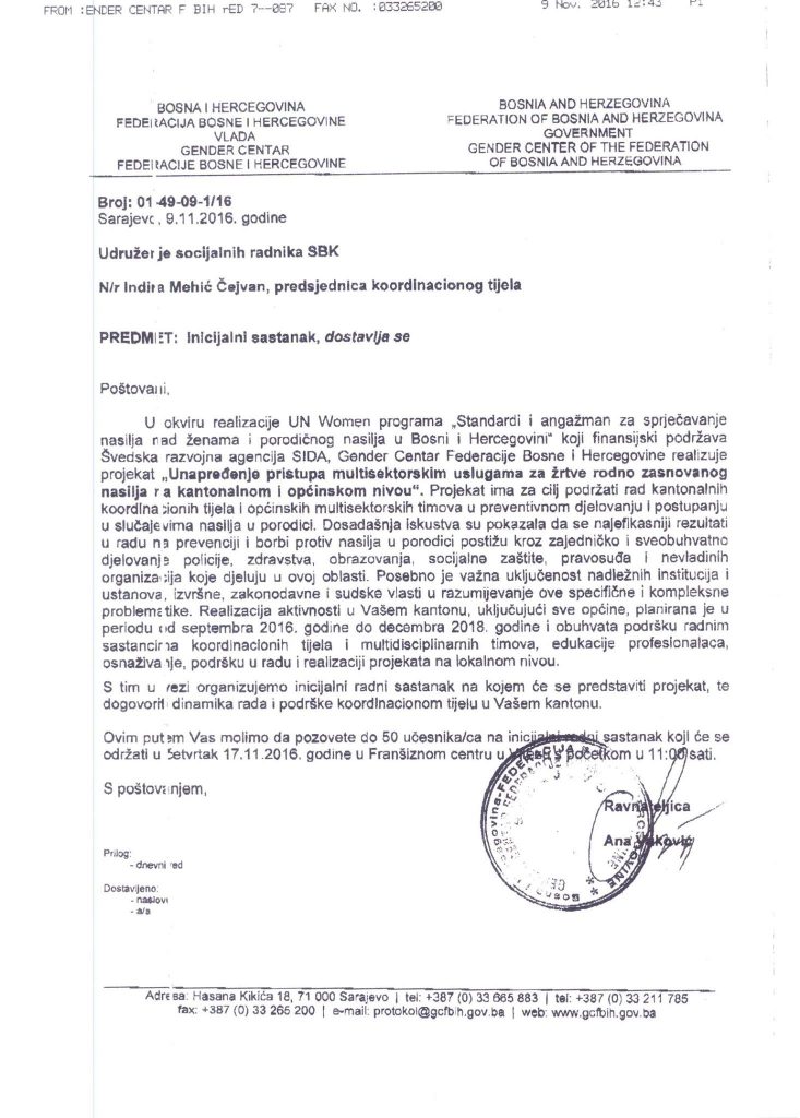 Dana 17.11.2016. je održan inicijalni radni sastanak za provedbu projekta"Unapređenje pristupa multisektorskim uslugama za žrtve rodno zasnovanog nasilja na kantonalnom